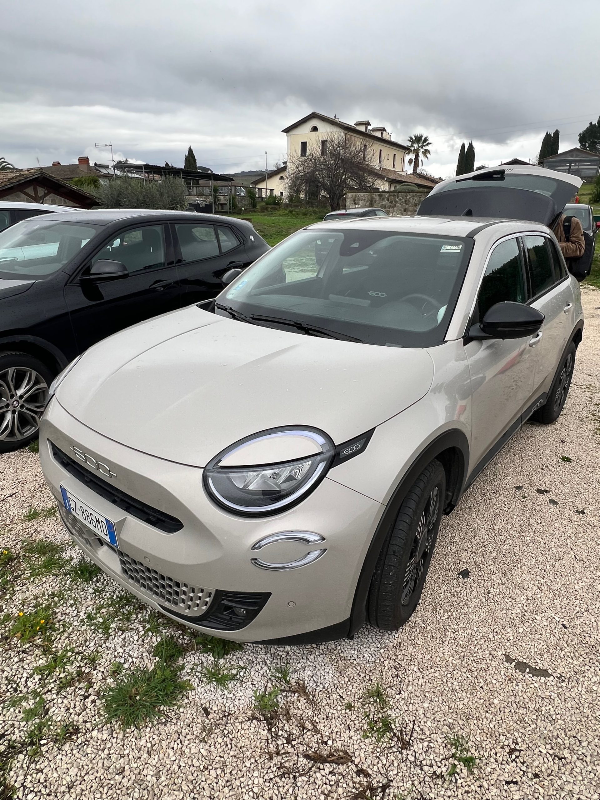 Šįkart skrydis vėlyvas: jis buvo kiek atidėtas ir lengvai panikavau. Laimei, tik pusvalanduką. Vis tiek skambinau į automobilių nuomos kompaniją ir bandžiau paprašyti palaukti, nes, panašu, kad vėluosime. Skrydis 20:30, leidžiamės 23:00, o nuomos kompanijos darbo laikas vos iki 23:00. Telefonu išklausiau italės šūkaliojimus: „Madam, very bad, very bad. Extra fee. Everything is closed in Ciampino at eleven ir t.t.” Dar pasiūlė „run”, kai nusileisime. Aišku, pakilome dar vėliau. Tik nusileidus Romoje, telefonas priminė, kad Italijos laikas – valanda atgal. Ech, galvelė. Valio! Išeinam iš oro uosto ir iškart matome autobusiuką, ant kurio šono automobilių nuomos kompanijų lipdukai, tarp jų – ir Locauto. Šokam į „shuttle”, kelios minutėlės ir įžengiame į Locauto ofisą 22:40. Dokumentai sutvarkomi greitai, tarytum, ne Italija. Mus palydi iki mašiniuko – kai pamatau, ką gavome, džiaugiuosi kaip mažas vaikas. Seniai svajojau pakeliauti po Italiją gražiuoju jų Fiatuku, o šis dar ir naujas hibridinis džipukas – Fiat 600.