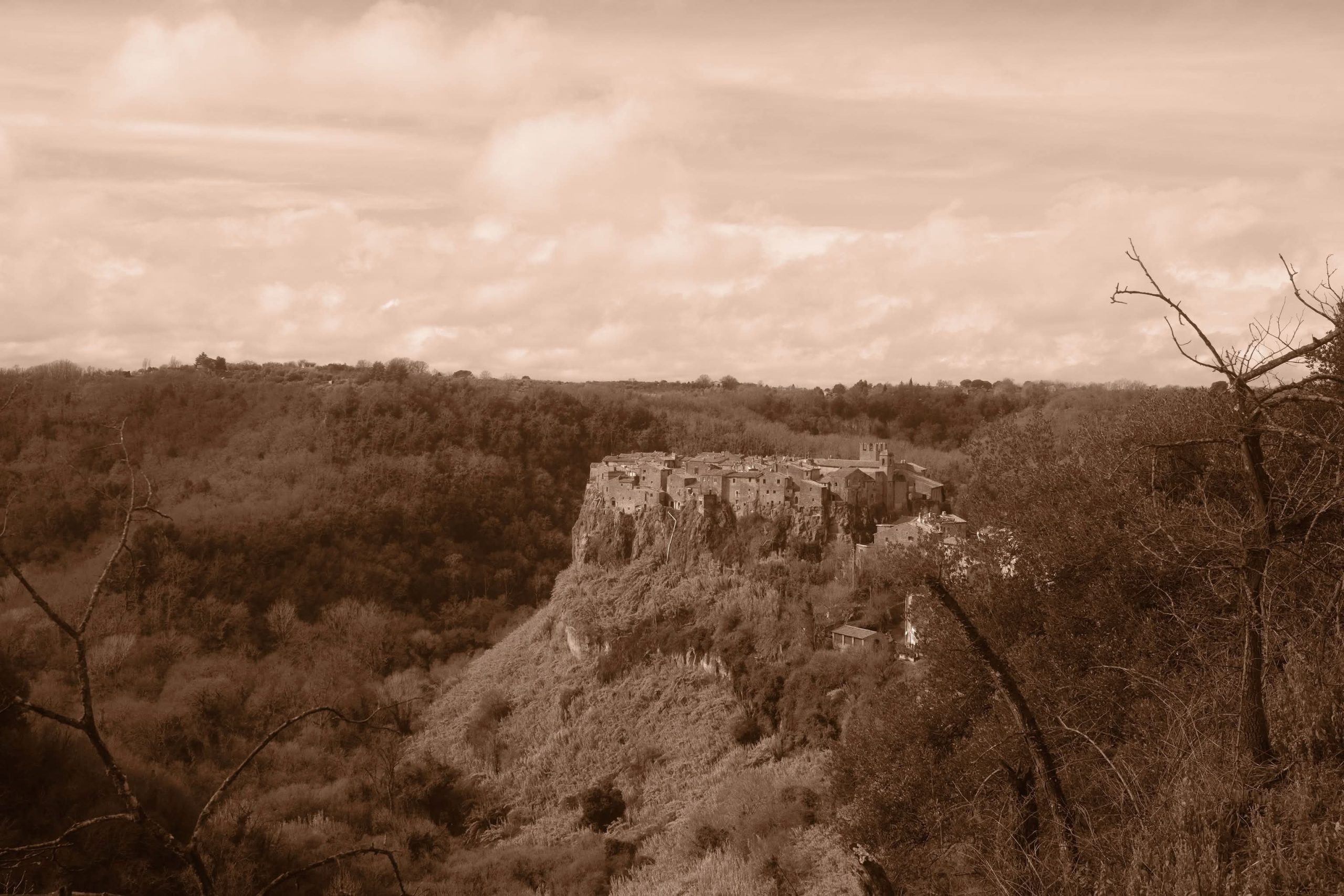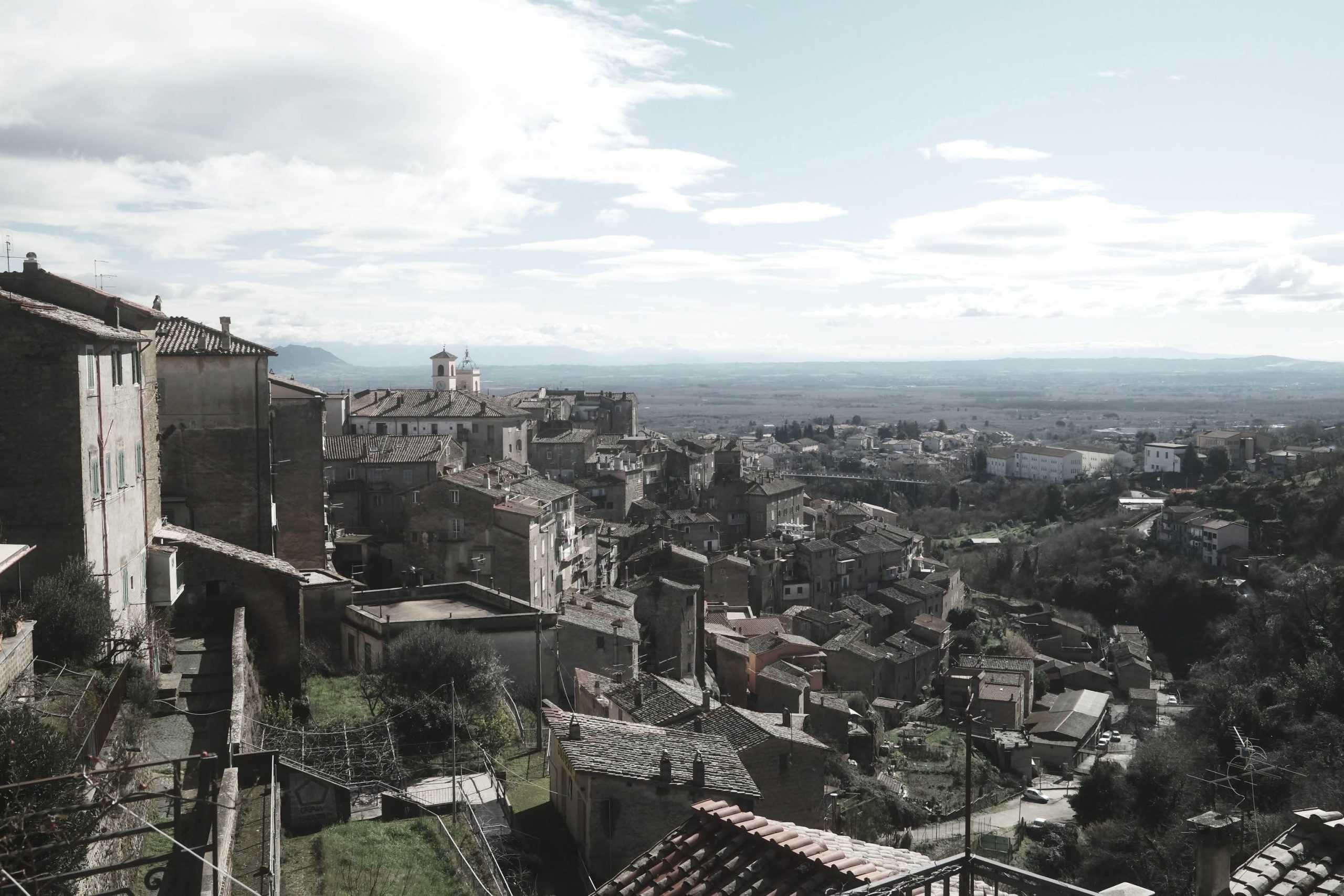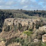 Calcata Vecchia atima kvapą – gražiausi vaizdai iš toliau. Ant uolos krašto sutupdyti namai susilieja su uoliena ir kalvą minkštai uždengusiais bei rudenį spalvą praradusiais augalais. Sunku suprasti, kur baigiasi žolynai, kur prasideda nameliukai. Juos tik langai ir dangus išduoda.
