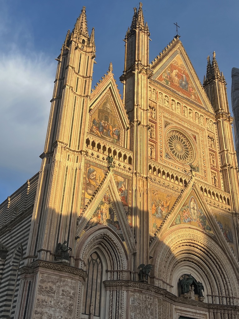 Orvieto katedra (Duomo di Orvieto) yra vienas įspūdingiausių Italijos gotikos šedevrų, garsėjantis stulbinančiu, spalvingu mozaikų fasadu (puoštas auksuotomis mozaikomis, bareljefais, skulptūromis, raižiniais, vaizduojančiais biblijinius siužetus) ir ir 300 metų trukusia statyba. Viduje ji nebuvo tokia įspūdinga, o gal mes tiesiog visko jau daug matę – tai kiek atbukina emocijas ir reakcijas. Atvažiuoti dėl Duomo ne tik verta, bet ir būtina. Nors man priminė Florencijos Katedrą, bet čia ji pribloškia netikėtumu – taip aukštai ant kalvos kažkur Umbrijoje pamatai tokį grožį!