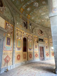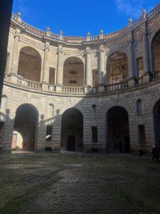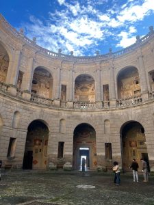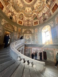 Mes atvykome sekmadienį – tuščia čia tikrai nebuvo. Pagrindiniai lankytojai – patys italai. Tokio grožio vilos mūsų akys seniai nematė. Keliavome per sales ir sunku buvo atsigrožėti. Ne veltui Villa Farnese yra viena įspūdingiausių Renesanso rezidencijų Italijoje. Pastatas yra penkiakampės formos – tai reta ir labai išraiškinga renesansinės architektūros kompozicija. Vila sujungia tvirtovės ir prabangios rezidencijos bruožus. Viduje – gausiai freskomis dekoruotos salės, mitologinės ir istorinės scenos, sudėtingos simbolikos programos. Tai vienas geriausių manierizmo interjero pavyzdžių.