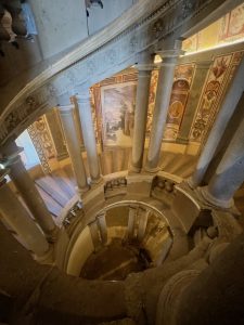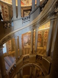 Mane pribloškė tik filmuose matyti spiraliniai laiptai: platūs, elegantiški, suprojektuoti taip, kad jais galėjo kilti net raiteliai. Vila stovi aukštai virš miestelio, todėl nuo terasų atsiveria nuostabus kraštovaizdis. Pastatas vizualiai dominuoja aplinkoje – labai fotogeniška vieta. Už rūmų – terasiniai sodai ir pavėsinės, suprojektuoti kaip poilsio ir reprezentacijos erdvė. Tai buvo galingos Farnese giminės reprezentacinė rezidencija – čia tarytum architektūra, politika, istorija ir menas susijungia į vientisą legendą, dėl kurios visi čia atvykstame.